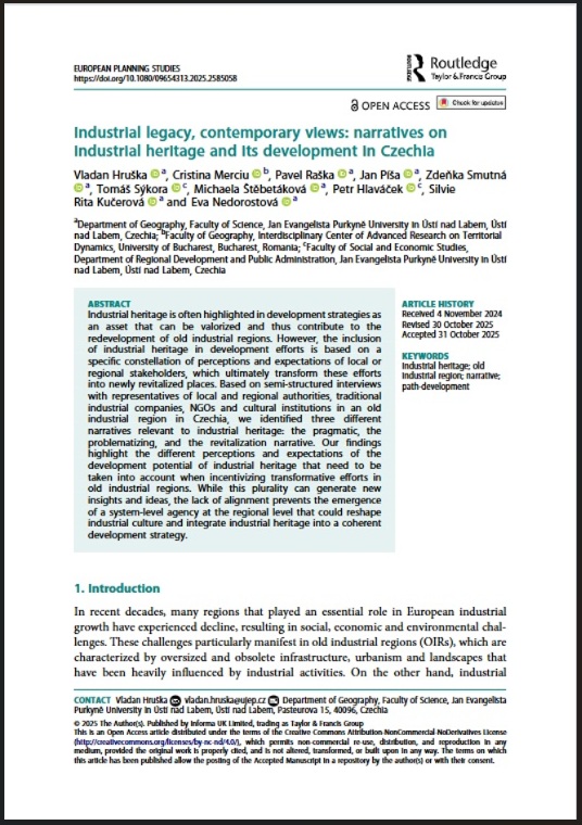 Hruška, V., Merciu, C., Raška, P., Píša, J., Smutná, Z., Sýkora, T., Štěbetáková, M., Hlaváček, P., Kučerová, S.R., Nedorostová, E. (2025). Industrial legacy, contemporary views: narratives on industrial heritage and its development in Czechia. European Planning Studies, 2024(12), 1-19. https://doi.org/10.1080/09654313.2025.2585058. [IF: 3,2, Q1]