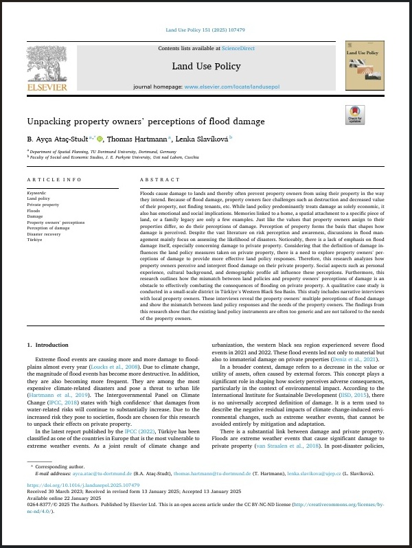 Ataç-Studt, B.A., Hartmann, T., Slavíková, L. (2025). Unpacking property owners’ perceptions of flood damage. Land Use Policy, 151(April 2025), 1-12. https://doi.org/10.1016/j.landusepol.2025.107479. [IF: 5,9, Q1]