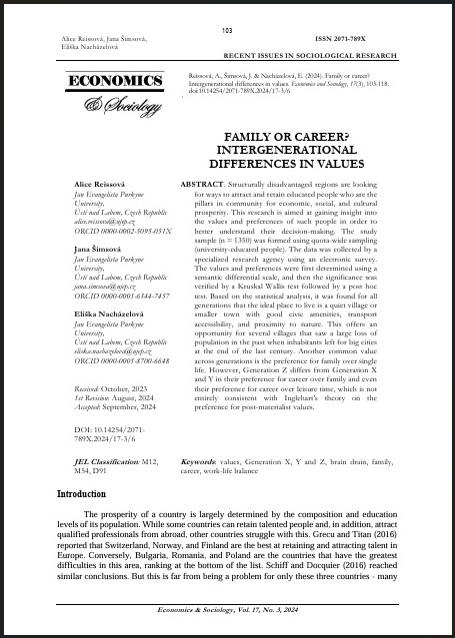 Reissová, A., Šimsová, J., Nacházelová, E. (2024). Family or career? Intergenerational differences in values. Economics and Sociology, 17(3), 103-118. https://doi.org/10.14254/2071-789X.2024/17-3/6. [IF: 2,1, Q2]