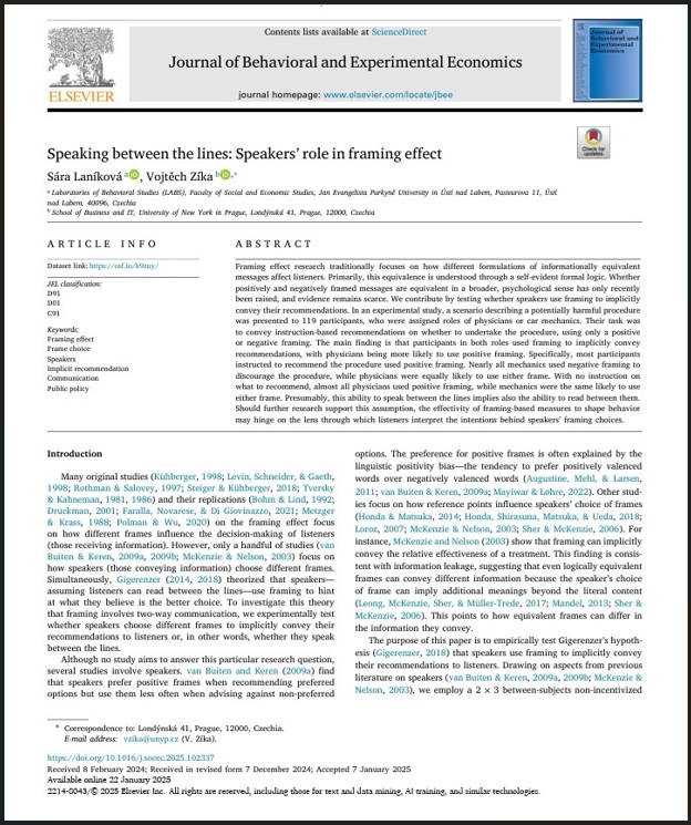 Laníková, S., Zíka, V. (2025). Speaking between the lines: Speakers’ role in framing effect. Journal of Behavioral and Experimental Economics, 115(April 2025), 1-11. https://doi.org/10.1016/j.socec.2025.102337. [IF: 1,4, Q2]